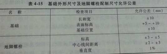 1.檢查基礎(chǔ)的外形尺寸,其公允公差見(jiàn)表4-15.