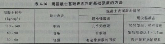2.混凝土基礎(chǔ)的質(zhì)量檢查,可用錘敲擊的方法判斷基礎(chǔ)強(qiáng)度,判斷方法見(jiàn)表4-16.